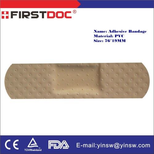 Medical product Band Aid76X19mm PVC Skin Adhesive Bandage Strip Product Description: Size 76X19MM Color Skin/tan/transparent/colored/cartoon Material Elastic fabric, PE, PVC Packing 10pcs/15pcs/25pcs/50pcs/75pcs/100pcs per box Printing Customized LOGO / label printing available upon MOQ order OEM/ODM OEM/ODM orders are welcomed Advantage 24-hour strong glue viscosity, good waterproof, breathable and anti-bacterium Application Small and minor wound care such as cuts, scrapes, abrasions and blisters. Certificate TUV CE, ISO13485, ISO9001:2008, FDA Product Features: 1. Super sticky glue can firmly adhere to skin, long-lasting effect. 2. Good ventilation and Latex-free. 3. Waterproof protection, keep the wound part dry and better for wound healing. 4. Easy remove without pain. User Manual: 1. Keep the wound part dry, and clean before sticking wound plaster onto the wound. 2. Replace wound plaster frequently to prevent any possible wound infection. 3. Keep away from direct sunlight, and keep in cool place.