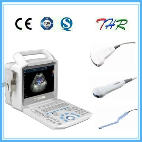 Color Doppler Ultrasound Scanner(THR-CD003V) Features: 1. Image Mode: B, 2B, 4B, M, B/M, CDFI, CDE, CCD, PW, CW. 2. Advanced Technology: 3D image supported. 3. One key image optimization: Various of inner checking types/checking types edition and creation/making superior image by pressing of doctor according to different checking types. 4. English guide system: Real time notice of operation steps, helping doctor get familiar with the operation of device quickly. 5. Auto freezing protection of the probe: Auto freeze the probe in the presetting time, lengthen the life of the probe. 6. English report system: Record the calculating parameters automatically, output English report directly; Make the inspection steps much more efficient. 7. Expansion port: Video port, S-Video port, RS-232 port, USB2.0 port, VGA port, DICOM3.0 port Probe supported: Convex probe, vaginal probe, linear probe, phrased array probe; Micro convex probe Standard Configurations: 12 inch LCD screen Pulse wave doppler High accuracy Digital Beam-Forming Dynamic Receiving Apodization High accuracy Dynamic Receiving Focusing Tissue Harmonic Imaging Wide screen imaging Image optimum processing Vascular Imaging Doppler Imaging DICOM3.0 320G Hard Disk DVD/CD-RW and USB Ports Measurement &Calculation Software Packageskageskages Convex array transducer. We have trolley type THR-CD003Q, THR-CD5000 and portable type THR-CD580. All four models are color doppler ultrasound scanner.
