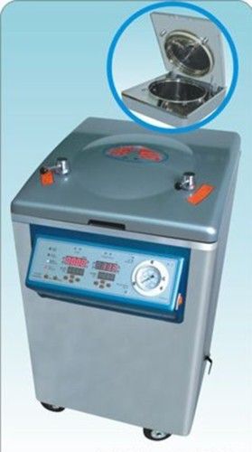 Made of stainless steel, durable; delicately clamshell structure, site automatically pops up, easy effort; slope control panel design, easy to observe the operation; microcomputer program control emissions cold sterilization procedures, heating, insulation timing and leakage pressure method; LED digital tubes and light, dynamic display equipment status; computer board with PID function, through the self-tuning correction heated argument, you can prevent red temperature, temperature accuracy within ± 0.5 ºC; low water level control, water shortage automatically stop heating and there are instructions prompt; has the 'inner loop' function, no steam released into the interior; temperature exceeds the set value 2 ºC, automatically stop heating, while sound and light alarms; overpressure relief valve automatically to 0.17MPa steam protective equipment; sterilizer chamber pressure can not be uncapped security measures; lid is not closed in place, without heating; and with LED indication; pressure inside the security status with LED indication; low water level control, water shortage auto-stop heating and there are instructions prompt; sterilization effect is reliable; drain valve barrel condensed water can be discharged to prevent fouling; casters with brakes shift nimble, easy positioning; immersion electric heating, high thermal efficiency.ng, high thermal efficiency.hermal efficiency.