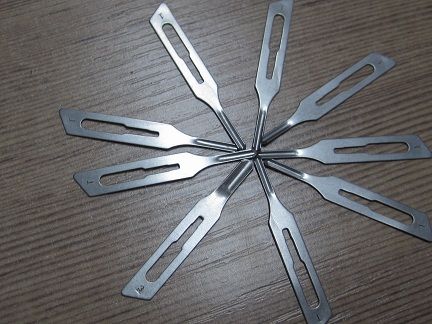 Specification: Stainless steel disposable gauge blade Professional manufacurer with CE and ISO Material: Stainless steel Size: 1#-12# Gouge blades are medical devices used for the removal of the superficial layers of the skin in the treatment of the epidermic pathologies of the foot. The gouge blades are generic products used by the Podiatrist. This tool exists in non-disposable form since at least the 19th century. The disposable form exists since second half of the 20th century. The disposable blades make it possible to use a single and sterile product for each patient. Gouge blades can be used with a standard metal handle of fitment 3 or with round collect handles made of either stainless steel or aluminum Packing: Neutral individual sterile packing / OEM available Lead time: 2-3 weeks / depending on quantity