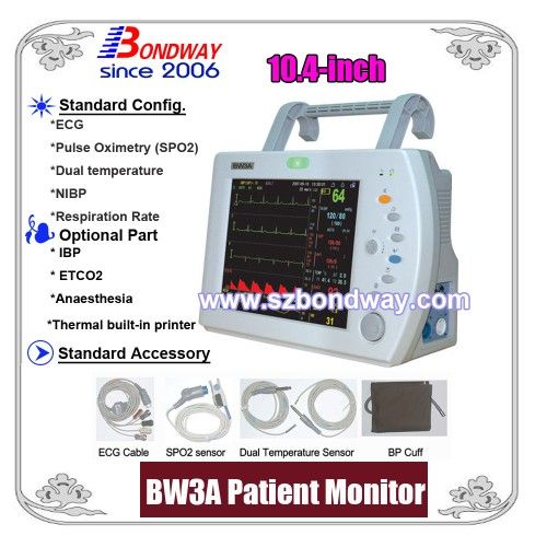 Multiparameter Patient Monitor Model No: BW3A TFT LCD size: 10.4-inch Features: 1) Attractive streamline outline design, portable, compact and lightweight 2) 12.1' color TFT LCD displayisplay 3) Operation menu with multi-language interface selection: English, Spanish, Portuguese, Chinese, French, German 4) Big Font Display 5) ST segment Analysis and Apnea Alarm function 6) Drug Dose Calculation and OXCRG Software 7) 72-hour tabular and graphic trends and data storage 8) High energy Li-ion battery for short-term transport and temporary power-down 9) Networking Capability. WAN communication function to network with central monitoring system and make long-distance monitoring, diagnosis, maintenance and software upgrade possible 10) Linux Operation System 11) External display(VGA interface) and external printer connectible to record tabular and graphic trend 12) Dynamic Monitoring of blood pressure 13) Intelligent audio and visual alarm 14) Application: Adult, Pediatric and Neonate 15) Pacemaker detection and Arrhythmia Analysis( Optional) Technical Specs ECG Input: 5 lead ECG cable Lead section: Lead I, II, III/ aVR, aVL, aVF/ V Gain(mm/mV): 1/4, 1/2, 1, 2, 4 Frequency response: Diagnosis 0.05 - 100Hz Monitor mode 0.5 - 40 Hz Surgery 1.0 - 25 Hz Sweep speed (mm/sec): 12.5, 25, 50 Heart rate range: 20-254 BPM ST segment deviation analysis: -0.8-+0.8mV Protection: Against electrosurgical interference and defibrillation NIBP Method: Automatic Oscillometric Measurement range: Systolic 4.0 - 37.0 kPa Diastolic 1.3 - 33.0 kPa Mean 2.6 - 35.0 kPa Scale: MmHg/Kpa Operating Mode: Manual/Auto/STAT Over pressure Protection: Yes SpO2 Measurement range: 0 - 100 % Pulse Rate range: 30- 254BPM Accuracy: ± 2 %smn; 2 %smn; 2 % Probe: For Neonate, pediatric, and adult Temperature Channel: Two Channels Measurement range: 29- 45Celsius temperature Accuracy: ± 0.1Celsius temperatureperatureperature Scale: Celsius/Fahrenheit RESP. Method: Impedance Measurement range: 0 - 120 BPM Lead Connection: RA & LL or RA & RA & RA; RA & RA Power requirements Input: 98~260 V AC, 50/60Hz Consumption: ≤ 80VA80VA80VA Safety standards: GB9706.1 IEC 60601-1 UL 544 EtCO2( Optional) Method: Side Stream Measurement range: 0 % - 10.0 % in CO2 and et CO2) Display: Waveform, Respiration Rate, EtCO2, FiCO2 Scale: MmHg/Kpa 2-IBP ( Optional) Channel: 2 Channels Parameter: SYS/DIA/MAP/Pulse Rate Scale: MmHg/kPa Recorder (Optional) Type: Built-in Thermal Recorder Print Mode: Waveform and/or Text