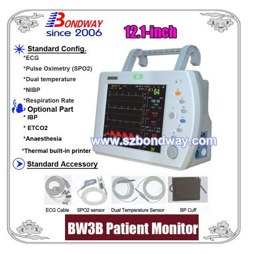 Multiparameter Patient Monitor Model No: BW3B TFT LCD size: 12.1-inch Features: 1) Attractive streamline outline design, portable, compact and lightweight 2) 12.1' color TFT LCD displayisplay 3) Operation menu with multi-language interface selection: English, Spanish, Portuguese, Chinese, French, German 4) Big Font Display 5) ST segment Analysis and Apnea Alarm function 6) Drug Dose Calculation and OXCRG Software 7) 72-hour tabular and graphic trends and data storage 8) High energy Li-ion battery for short-term transport and temporary power-down 9) Networking Capability. WAN communication function to network with central monitoring system and make long-distance monitoring, diagnosis, maintenance and software upgrade possible 10) Linux Operation System 11) External display(VGA interface) and external printer connectible to record tabular and graphic trend 12) Dynamic Monitoring of blood pressure 13) Intelligent audio and visual alarm 14) Application: Adult, Pediatric and Neonate 15) Pacemaker detection and Arrhythmia Analysis( Optional) Technical Specs ECG Input: 5 lead ECG cable Lead section: Lead I, II, III/ aVR, aVL, aVF/ V Gain(mm/mV): 1/4, 1/2, 1, 2, 4 Frequency response: Diagnosis 0.05 - 100Hz Monitor mode 0.5 - 40 Hz Surgery 1.0 - 25 Hz Sweep speed (mm/sec): 12.5, 25, 50 Heart rate range: 20-254 BPM ST segment deviation analysis: -0.8-+0.8mV Protection: Against electrosurgical interference and defibrillation NIBP Method: Automatic Oscillometric Measurement range: Systolic 4.0 - 37.0 kPa Diastolic 1.3 - 33.0 kPa Mean 2.6 - 35.0 kPa Scale: MmHg/Kpa Operating Mode: Manual/Auto/STAT Over pressure Protection: Yes SpO2 Measurement range: 0 - 100 % Pulse Rate range: 30- 254BPM Accuracy: ± 2 %smn; 2 %smn; 2 % Probe: For Neonate, pediatric, and adult Temperature Channel: Two Channels Measurement range: 29- 45Celsius temperature Accuracy: ± 0.1Celsius temperatureperatureperature Scale: Celsius/Fahrenheit RESP. Method: Impedance Measurement range: 0 - 120 BPM Lead Connection: RA & LL or RA & RA & RA; RA & RA Power requirements Input: 98~260 V AC, 50/60Hz Consumption: ≤ 80VA80VA80VA Safety standards: GB9706.1 IEC 60601-1 UL 544 EtCO2( Optional) Method: Side Stream Measurement range: 0 % - 10.0 % in CO2 and et CO2) Display: Waveform, Respiration Rate, EtCO2, FiCO2 Scale: MmHg/Kpa 2-IBP ( Optional) Channel: 2 Channels Parameter: SYS/DIA/MAP/Pulse Rate Scale: MmHg/kPa Recorder (Optional) Type: Built-in Thermal Recorder Print Mode: Waveform and/or Text