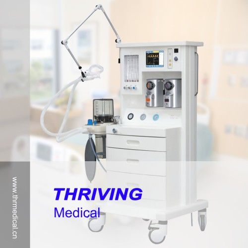 Anesthesia Equipment (THR-MJ-560B5 ) Descriptions of THR-MJ-560B5 Anesthesia Equipment: MJ-560B5 Anesthesia Machine, with its ergonomic design, integrates a concise and smooth structure and high mobility. The microcomputer-controlled Ventilator adopts exported sensors and other components. Its scientific and proper design as well as rigorous production process are what demonstrate the inner quality of Aokai products: Mechanical ventilation is made secure and visible by the folded respiratory bellows, and the security of air supply is guaranteed by pneumatic transmission and measurement system. With multiple modern technologies applied, the Anesthesia Machine is both outstanding in performance and versatile in functions. Features of THR-MJ-560B5 Anesthesia Equipment: The Ventilator adopts microcomputer control with high-definition 8.4' TFT color LCD display, integrating the functions of respiratory control and displaying the monitoring parameters. It is versatile in function and excellent in performance.mance. The high-precision Vaporizer is designed with a stable concentration output, automatic compensation for pressure, temperature and flow rate. And it is available to choose two kinds of gas from Halothane, Enflurane, Isoflurane, and Sevoflurane, ensuring a successful anesthesia operation. High-definition five-tube flowmeter (oxygen, nitrous oxide, and air), designed with stoppers for oxygen and nitrous oxide to control the output oxygen concentration. Reliable pneumatic transmission system. Economic and proper configuration of technologies, optional as required by the Customer. Modularized design and upgrading. Upgrading is available as required by the Customer. Optional: CO2 concentration monitoring