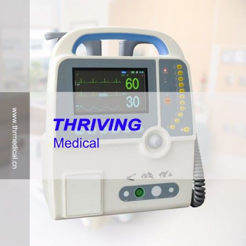 Biphasic Defi-monitor(THR-MD-800D) Physical characteristics: Main unit: Portable Dimensions: L320xW205xH410 Weight: 9.5kg Technical specifications DEFIBRILLATOR. (1)Defibrillator type Manual, Synchronized, Asynchronized, (2)Out put waveform Biphasic technology (3)Energy accuracy +1% (4)Energy selection 0, 3, 5, 7, 10, 20, 30, 50, 100, 200, 300, 360 joule(nominal at a resistance of 50) (5)Charging time Maximum 8 seconds to 360 Joules (6)Standard Adult/Pediatric Paddles Reusable external adult paddles(pediatric paddles integrated) Power requirements. (a)AC Power supply 110V, 60 Hz /220V, 50 Hz (b)Vehicle Voltage DC 12V Internal Battery Backup (1)Battery type Rechargeable lead-acid battery (2)Charging time Time-Minimum of 4 hours for full charging (3)Battery charging During AC Power Supply operation of the device. (4)Charging /Low Battery Indication Red LED (5)Battery Capacity 100% of the battery will provide 120 mins of monitoring; And 30 discharges at 360 joules. Display -LED Dimensions 7'diagonal {155mm*88mm} which is easily read from a distance. -Type High resolution true-color graphic LED -Resolution 480X234 - Provide cardioversion facilities with waveform annotated on the screen - Display 4 seconds of ECG at 25mm/sec, ECG selectable from leads I, II, III when used with a 3-lead cable, and I, II, III aVL, aVR, aVF and V when used with a 5-lead cable. - Display prompts, waveform settings, battery status, event summary and fault codes. Energy selected is displayed by push button under the screen. ECG ECG lead: I, II, III, AVR, AVL, AVF, V1~V6, GND S-T segment analysis: -2.0~2.0mv Arrhythmia analysis: Yes Protection: With stand 4000vAc/50Hz voltage in isolation and work against electrosurgical knife and defibrillation Respiration Measurement method: Thoracic impedance Standard parameter & configurationrationation ECG/ RESP/DEFIBRILLATOR -Provide audible and visual alarms for heart rate violations, VF and VT. -Provide a strip printer which annotates waveforms, events, time code -Have a 5-lead patient cable as an option to a 3-lead cable. -Supplied with external re-usable paddles and packs of paper rolls for the printer.