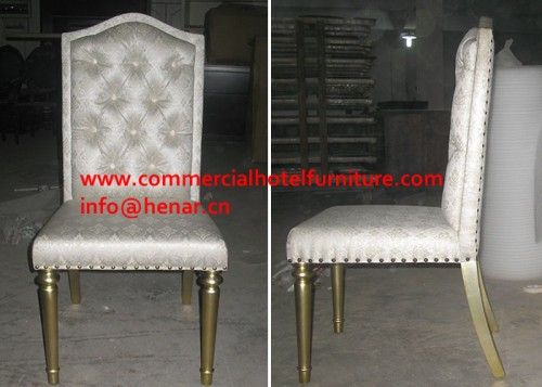 Luxurious Style Fabric Dining Room Chairs With Button - Tufted Specifications: Add luxurious style to your dining room table with this bold Diamond dining chair. Made with solid wood legs, tufted fabric and unique filigree elements, this comfortable chair will please guests for years to come. Materials: Fabric, wood Finish: Goldleaf Upholstery color: Yellow Upholstery fill: Polyester Applications: