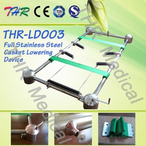 Casket lowering device(THR-LD003) 1. Made of high quality stainless steel 2. Telescopes from 62'*25'to94'*38't;to94"*38"t;*38" 3. Steady lowering speed THR-LD003-I casket lowering device: This casket lowering device is our company latest products! The unit telescopes from 62' X 25' to 94' X 38' for easy handling.t; for easy handling. 1) The unit telescopes from 62' X 25' to 94' X 38' for easy handling.t; for easy handling. 2) Gears are large and tested to bear loads in excess of demand. 3) A unique braking system provides a constant, steady lowering speed. 4) Ball bearings throughout for noiseless, smooth, and fully automatic operation. 5) Castings are of non-corrosive aluminum and easy access to all internal working parts 6) Loading capacity: 450 kg 7) Packing info.: 0.2 CBM/CTN, N. W/G. W: 90 kg/95 kg 8) User's manual: Available