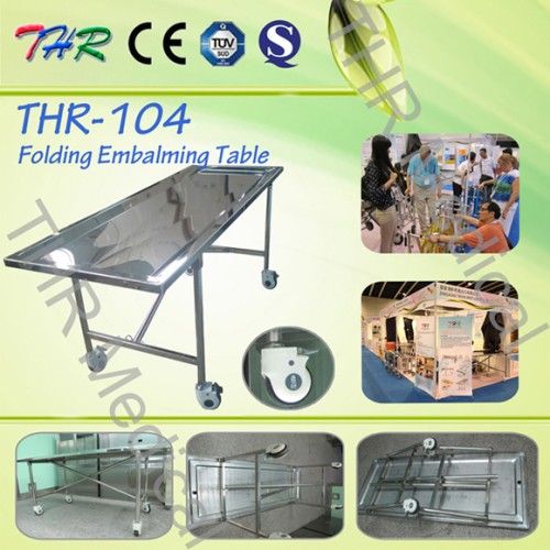 Funeral Embalming Table (THR-104) Detailed Product Description: The Model THR-104 Folding Operating Table is truly a combination table, ideal for embalming, dressing and transfer. An exclusive, one-hand release easily adjusts eitherend of the table from 32-1/2' to 38-1/2' with the ends being independently adjustable. adjustable. The table is constructed of a stainless steel top with a convex surface, tubular aluminum frame and 6' ball-bearing wheels. The swivel wheels lock to keep the table stationary while in use. The drain, located in the center of the foot end, quickly eliminates fluid from the table. Model 104 folds for storage when not in use. It can stand on one end for storage behind a door or in a closet.loset. Features: Folded table can stand on one end for storage behind a door or in a closet Combination table ideal for embalming and transfer Exclusive one-hand release adjusts either end of table from 32-1/2' to 38-1/2' Ends are independently adjustable 6' wheels lock to keep table stationary while in use Product Specificationst Specifications Length: 80' (205cm)(205cm) Width: 30' (77cm)(77cm) Height: Max: 38.5' (99cm)(99cm) Min: 32.5' (83cm)(83cm) Wheelbase: 69.5'x27' (178x69cm) (178x69cm) Weight: 83lb. (37kg) Load Limit: 600lb. (272kg)