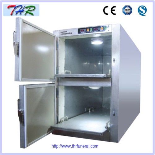Double Corpse Refrigerator (THR-FR002) Breif Description: 1. The insulating layer is made of imported polyurethane foam materials with high thermal retardation against cold loss. 2. The internal and external shells of the refriger are made of high quality stainless steel materials. 3. Imported Bi-Sonic Fan motor 4. Imported DANFOSS Ultra-mute compressor 5. Computer temperature controller 6. Safe door lock system 7. Adopt the high quality gel strip for door gasket with strong ageing resistance ability, which can lengthen the service life of the door gasket 8. Platinum resistor temperature sensor 9. The refrigeration system of each chamber is individually controlled, and the temperature can be adjusted without interference. 10. Copper vaporizer cooling pipeline can guarantee the ultra-long service life.