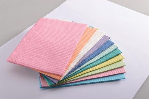 Specification: 1) Dental bibs: 1ply paper+1ply PE film 2) Size:33*45cm 3) Disposable, can do printed design 4) Many colors for option 5) With CE and ISO Packing: neutral packing or OEM available Payment: by various kinds of term of payment Lead time: within 3 weeks/ depending on quantity