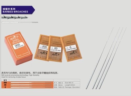 Dental Barbed Broaches (without handle) Made of high quality medical Stainless Steel With precise processing technology, products in good flexibility and broken-anti ability For removing pulp tissue, root canal dead tissue, scraps, cotton twist, and fidibus High-temperature sterilization is allowable Packed with 10 files per box, available of single sizes We may provide OEM products or private labeling, and we may make different work length, size or package if you required! Length: 52mm Size: 0, 00, 000