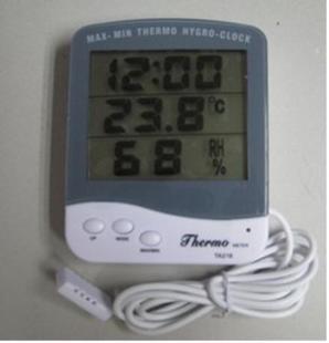 Behind the machine fitted with a battery door open AAA batteries, the screen displays the time, temperature and humidity.