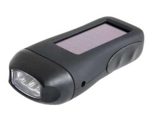 | Solar powered & hand-powered LED flashlight No batteries required 2 Modes: 1LED and 3LED Can be an emergency charger for your mobile phones Compact size for ease of carrying | |