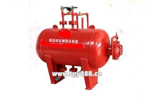Pressure foam proportioning device main body, capsules, proportioner, inlet pipe, outlet pipe, drain valve, drain valve, safety valve, pressure gauge each line are equipped with a valve, water pipeline On equipped with a pressure gauge, a capsule fitted in the tank body, the cavity and the tank chambers are independent. It is used to store foam extinguishing agent, and by the action of pressure proportioning mixer, the fire water stored in the device replacement foam extinguishing agent, and with a certain proportion of water mixed foam mixture in the form of the apparatus for forming the structure of the tank is divided into: horizontal and vertical ratio proportioning device mixing devices; mixer divided by the number of proportion: Single the proportion of mixer devices and multi-mixer ratio (2 or 4) mixing device.