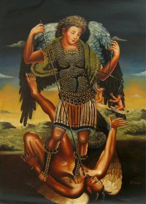 This beautiful oil painting on canvas depicts the Archangel Saint Michael, stepping on the defeated evil.