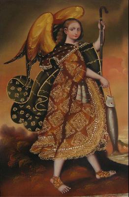 Her regal clothing and halo are exquisitely embellished with golden leaf, an indicative of the Cusco School of Arts