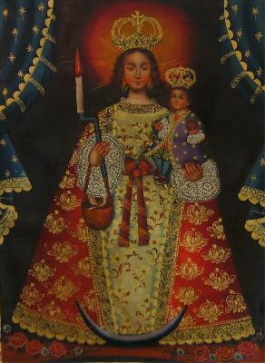 She holds a candle and they both bear golden crowns. Two blue curtains complete this magnificent scene.