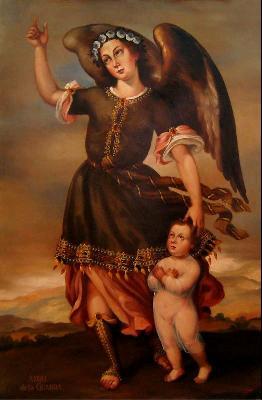 This huge oil painting on canvas depicts the Guardian Angel with the divine Child.