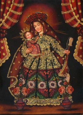 This impressive oil painting depicts the Andes Lady holding the divine Child Jesus.
