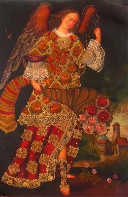 An incredible depicition of the Archangel Gabriel, this magnificent painting will definitely leave you in awe as soon as you lay eyes on Composition and rich colors are absolutely remarkable. A wonderful addition to our team of great masters of the Cusco School of Painting, the author of this oil has accomplished a superb technique and incredible skills to be able to create such a masterpiece. An exhibition of the utmost beauty and singularity.