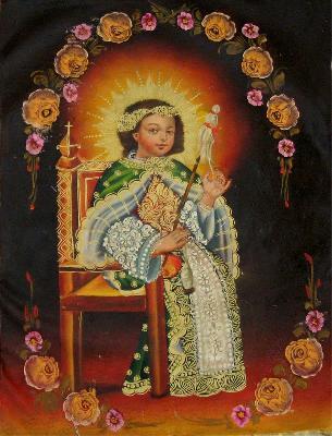 This image of the young Virgin at her tasks is rare in European art outside Spain, where its earliest appereance seems to be in a painting by Juan de Roelas. In the Viceroyalty of Peru, the image was often paired with a pendant painting showing Christ as a boy with the crown of thorns, upon which he has pricked his finger, in his lap.