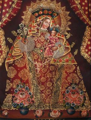 An exquisite portrait, details are richly embellished with bronze leaf, an indicative of the artists of the Cusco School of Painting.
