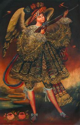 A mid-eighteenth-century visitor to Lima describes the viceroy's bodyguard-all Spaniards-as 160 horsemen, with captain lieutenant, in blue uniforms turned up with red and laced silver; an infantry consisting of 50 halbardiers in blue with crimson velvet waistcoats laced with gold. The officers shoes were often fastened with diamond buckles, even pearls. Some wore heels of wrought silver. Small wonder the extravangances in the portrayal of an archangel !