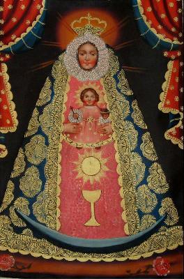 This is a truly unique vision of Our Lady of Bethlehem. Moving scene, it was painted with meticulous detail. Her regal, exquisite brocade gown and halo are embellished with bronze leaf.
