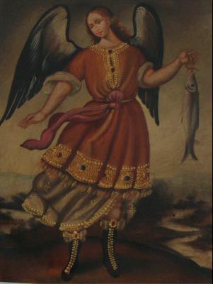 Raphael's Hebrew name means medicine of God or God has healed'. He is one of the three most important of the archangels, the benign friend of all humanity, protector especially of the young, the wayfarer and the pilgrim. The fish in one of his attributes. According to the legend, the young Tobias set forth on a journey for his father, who felt that death was near. Asking the way, he was joined by the Archangel Raphael who, unrecognized, rescued him from being devoured by a great fish. The gall of the creature which Raphael captured miraculously healed Tobias, father of blindness. Thus the Archangel became also the patron of doctors, healers and medicine men. If this was well understood in Alto Peru, the Indians could associate the Biblical figure with the practice of their own medicine men, who often used animal parts in their treatment.