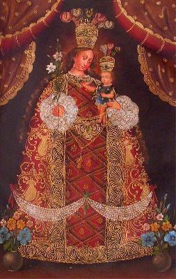 This oil painting on canvas depicts the Mamacha Madonna the infant Jesus with her left hand and a stem of lilies with her right hand. The Infant holds a blue sphere with a golden cross on top. They both wear feathered crowns and a set of red tapestries complete his unique depiction.
