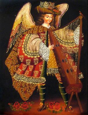 This impressive oil painting depicts one of the colonial musician archangels playing the harp.