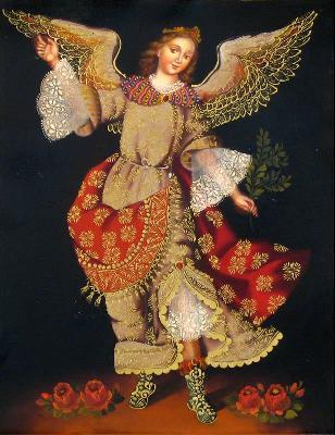 In this painting he wears a silken gold brocaded tunic. The deep lace flounce on the kiltlike lower section matches the flowing sleeves. His footwear is a high leather shoe with gold lacing and trim. Fine soft stockings are held in place with jeweled buckles, and brooches also clasp the sleeves and collar. The half-open wings and swirling cloak give the impression that he has just landed from on high-even of weightlessness. Here we see the metamorphosis of the traditional stiff figure into Baroque exuberance-a style peculiar to Alto Peru. Even in Mexico such flamboyance is not encountered.