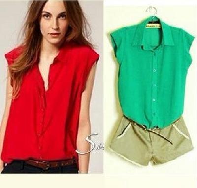 This sleeveless shirt is one of my favorite styles; chiffon material make clothes very vertical texture; fleshy MM had to wear the same thin; many bright candy colors cute take any of a variety of clothes; whether it is trousers; skirt; jeans are very no good; the quality is good value for money; like MM do not hesitate