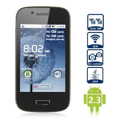 | Type: Touch screen phone Color: Black OS: Android 2.3 CPU: SP6820A 1.0GHz ROM: 256MB RAM: 256MB Battery: 1800mAh Li-ion Capacitive touch Screen Network frequency: GSM 850/900/1800/1900MHz Dual SIM, Dual standby Dual cameras (the back one with flash light) Wireless internet FM/ MP3/ MP4/ Bluetooth function supported |