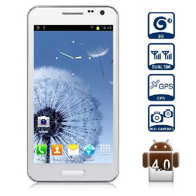 | Type: Touch screen phone Color: White OS: Android 4.0.4 CPU: Media Tek MTK6577 Dual Core 1GHz ROM: 4GB RAM: 512MB Battery: 1850mAh Li-ion Capacitive touch (5-point) screen Network frequency: GSM 850/900/1800/1900MHz WCDMA 2100MHz Dual SIM, Dual standby Dual cameras (the back one with flash light and auto focus) Wireless internet GPS supported Gravity sensing system FM/ MP3/ MP4/ Bluetooth function supported |