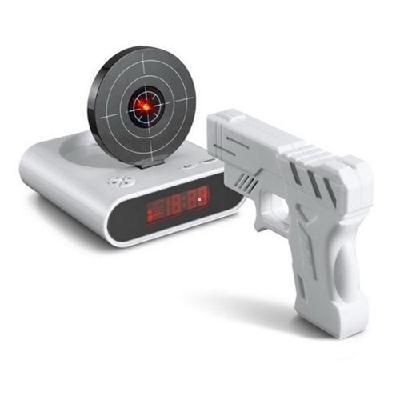 Fun, innovative pistol shooting alarm clock when the clock until the clock time will sound for 3 minutes continuously and targets will be erected.