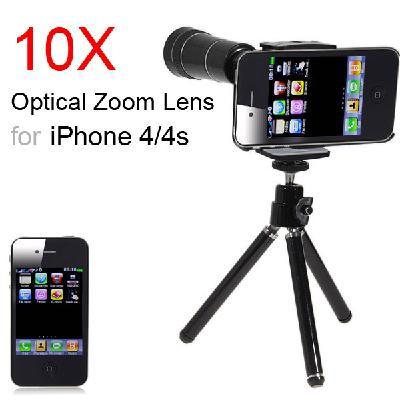 This product comes with an 10X zoom optical telescope lens; a protective cover for iPhone 4 4S; and a tripod
