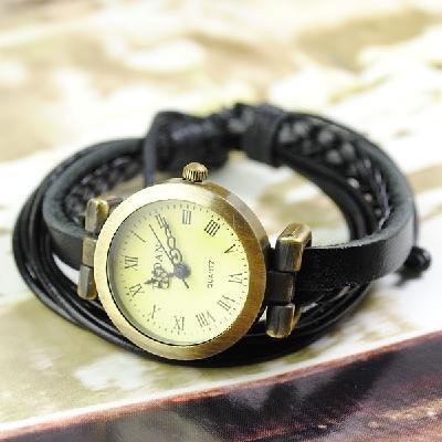Vintage Ladies Womens Knitted Genuine Leather Band Cuff Hemp Bracelet Wrist Watch