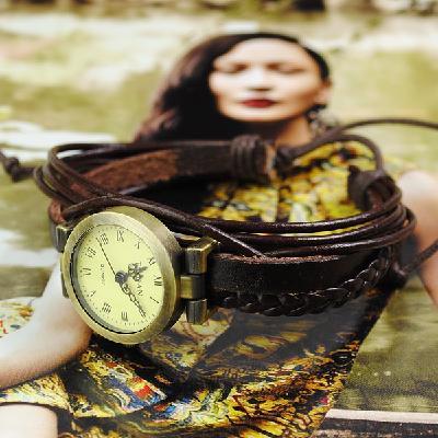 Vintage Ladies Womens Knitted Genuine Leather Band Cuff Hemp Bracelet Wrist Watch