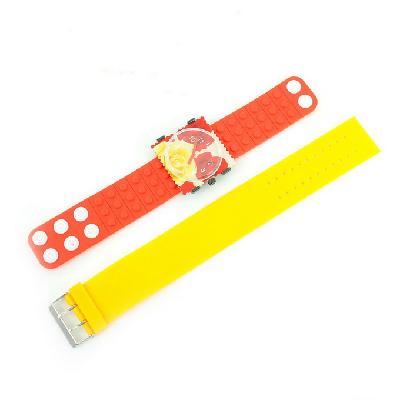 The light yellow band is made of PVC with 11 lines holes and the red band is made by silicone with 3 lines snap closures which you can adjust the size to fit your wrist.