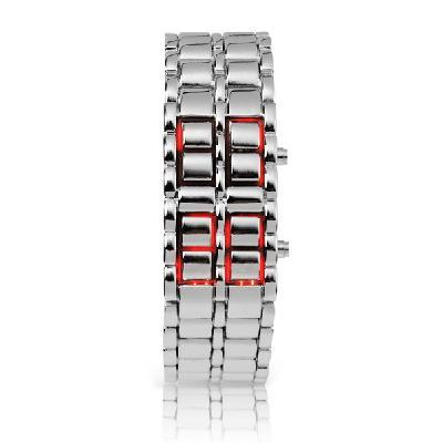 Touch the edge of time key, when the LED lamp is lit, dark red light through the 'bracelet' emitted light, it immediately becomes ultra-high definition LED electronic watches. Even more amazing is that every time digital, just fit between the cracks in the metal block.