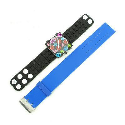 The thumb blue band is made of PVC with 11 lines holes and the black band is made by silicone with 3 lines snap closures which you can adjust the size to fit your wrist.
