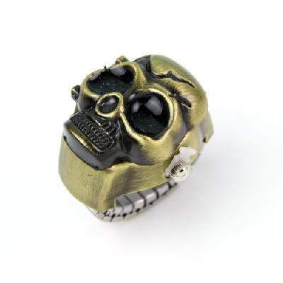 Lady's Stainless Steel Dark Green Ring Watch with Diamond Skull Head Cover