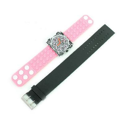 The black band is made of PVC with 11 lines holes and the hermosa pink band is made by silicone with 3 lines snap closures which you can adjust the size to fit your wrist.