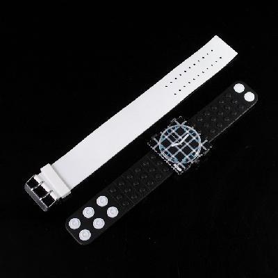 The white band is made of PVC with 11 lines holes and the black band is made by silicone with 3 lines snap closures which you can adjust the size to fit your wrist.