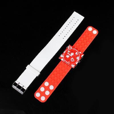 The white band is made of PVC with 11 lines holes and the red band is made by silicone with 3 lines snap closures which you can adjust the size to fit your wrist.