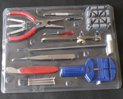 Includes: Link Removal Tool; Watch Case Opener; Soft Work Pad; Double Headed Hammer (nylon / steel), Case Opener Knife, Fine Nosed Tweezer, Plier, Spring Bar Tool & Link Pin Punch and Screwdrivers.