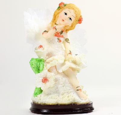 The guardian angel has a beautiful dainty little face with dark eyes, a cute little nose and perfect pale red lips, beautiful and pure. She sits on the flowers and her wide spread wings are detailed and show all of her beautiful feathers which are made of genuine animal's feathers.