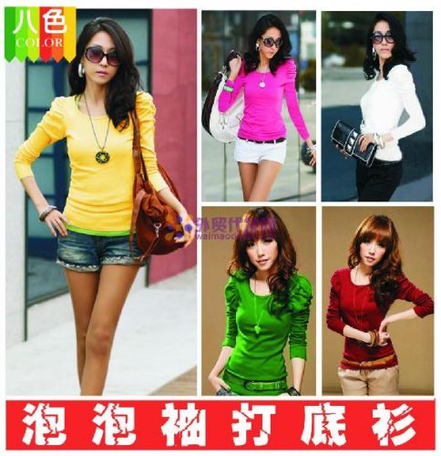 Women's fashion round neck Puff solid color sanding rib long-sleeved T-shirt bottoming shirt ladies