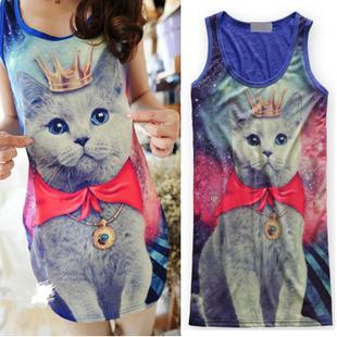 New Fashion Galaxy Prince Crown Cat Tight Dress Women Vests Long Shirt Tops Vest