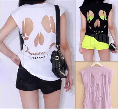 NEW WOMENS LADIES SLEEVELESS LONG CUT OUT BACK SKULL T SHIRT WOMENS TOP